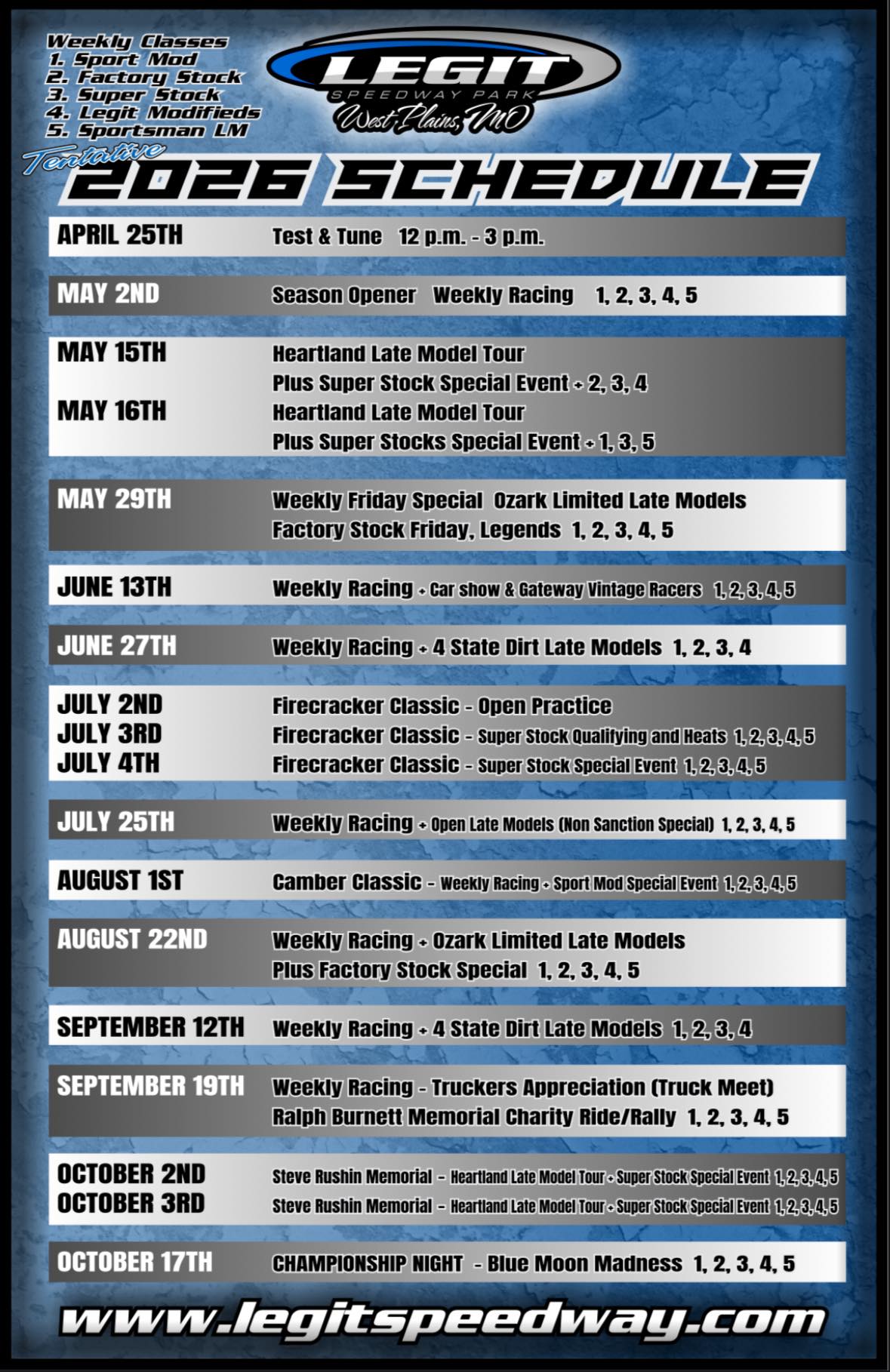 Legit Event Schedule Revised for Re...Legit Event Schedule Revised for Remainder of 2023 Season https://www.legitspeedway.com/schedules/ -The August 5th event has been canceled due to conflicting motorsports events in our local area. Two motorsports events in a small town on the same night with already limited s...
