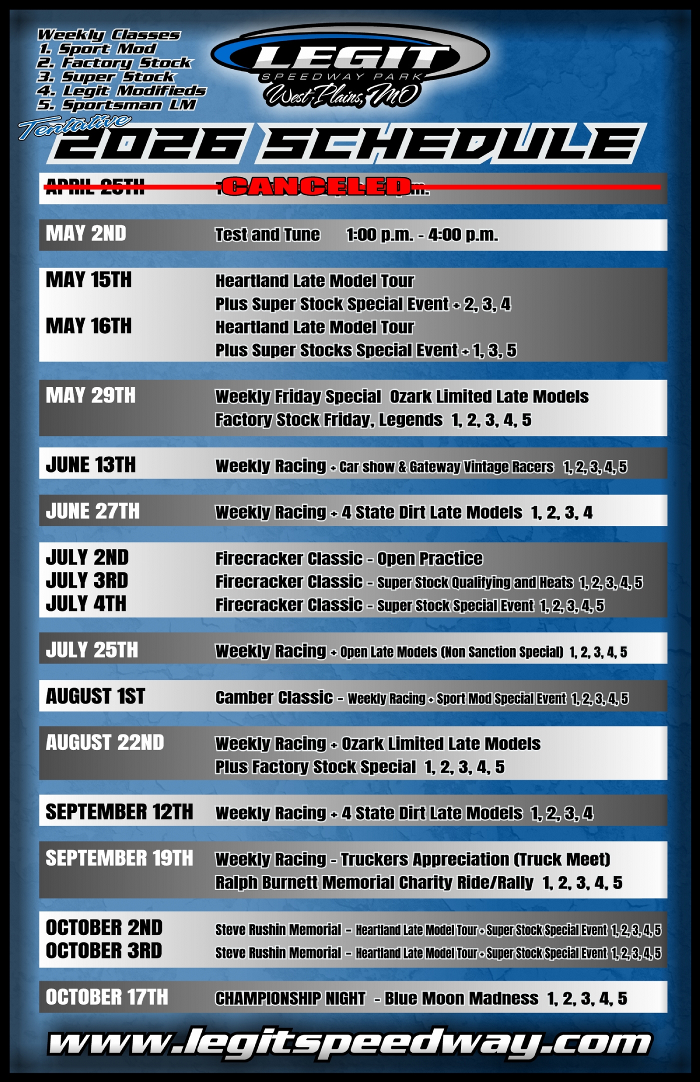Legit Speedway Park racing in 2026Legit Speedway Park will open , the 2026 season will begin wth a Test & Tune from 12-3 p.m. on Saturday, April 25, followed by the weekly racing season opener the following Saturday, May 2.